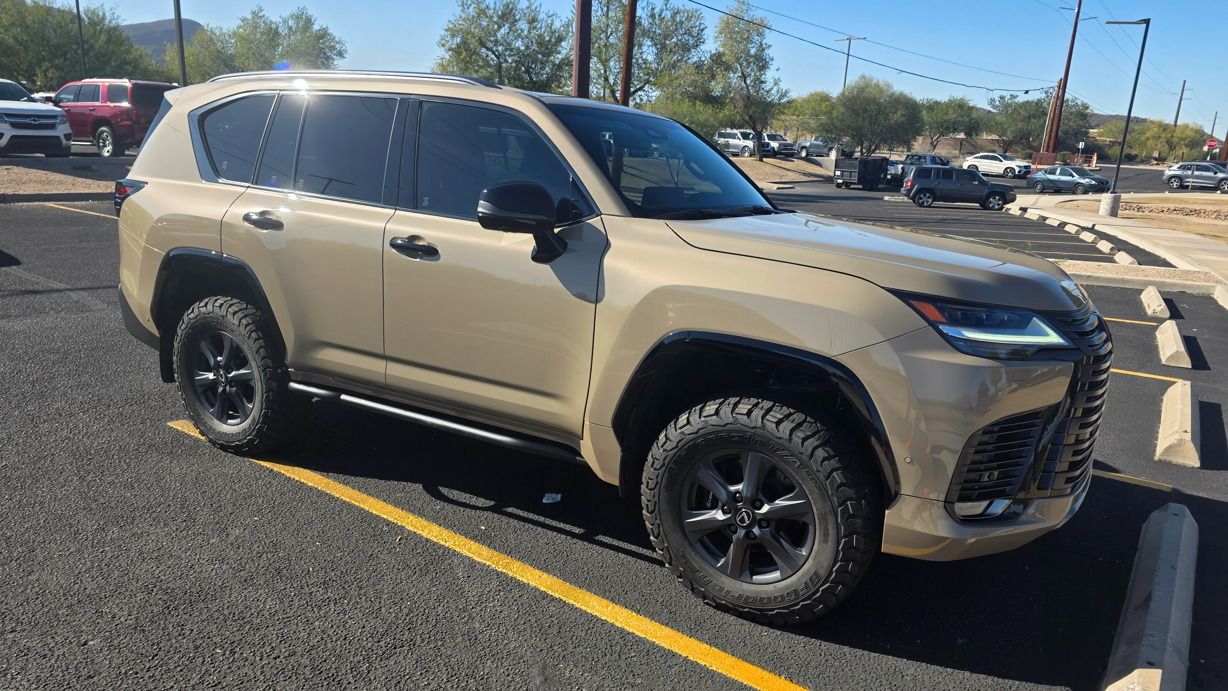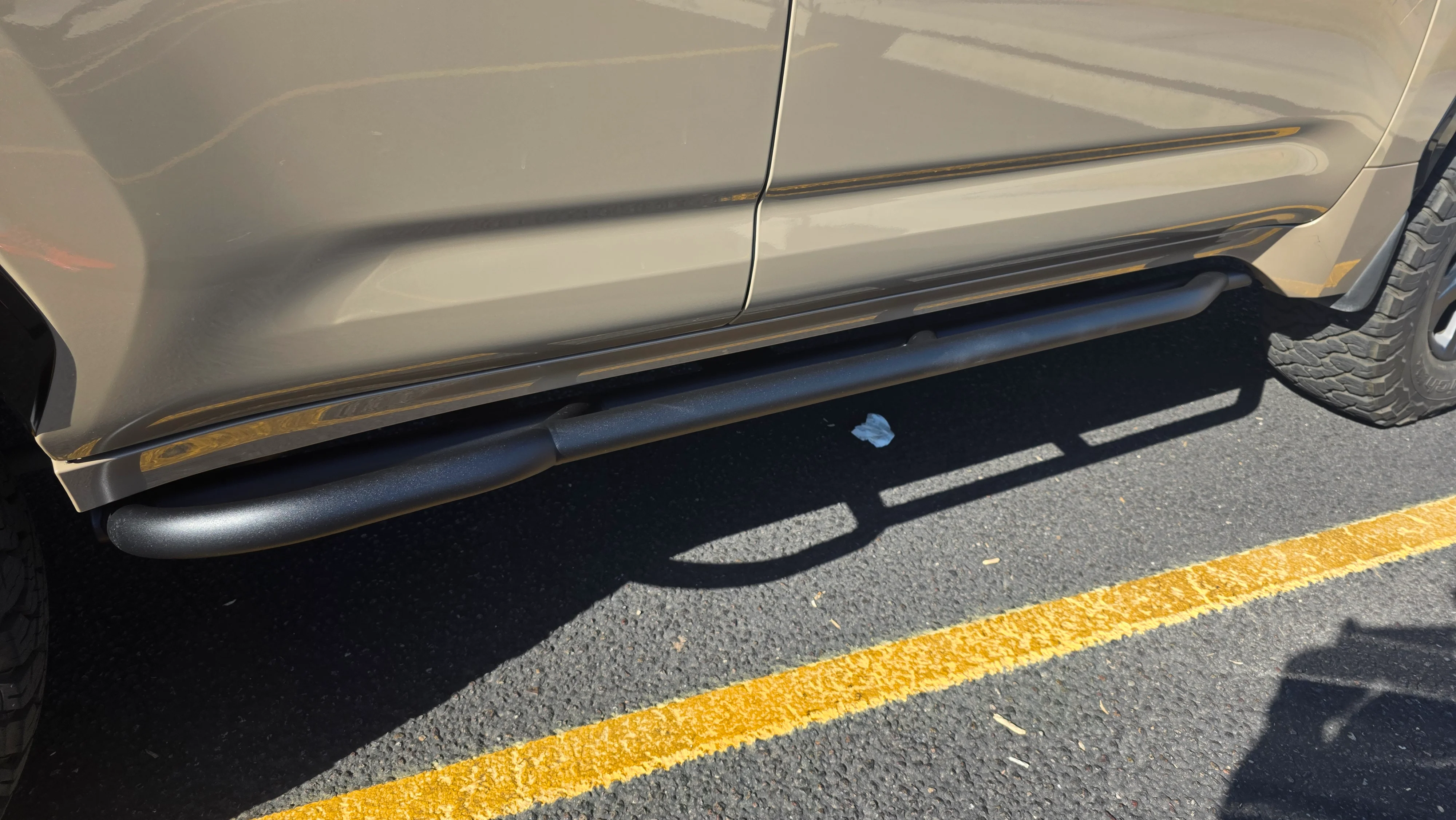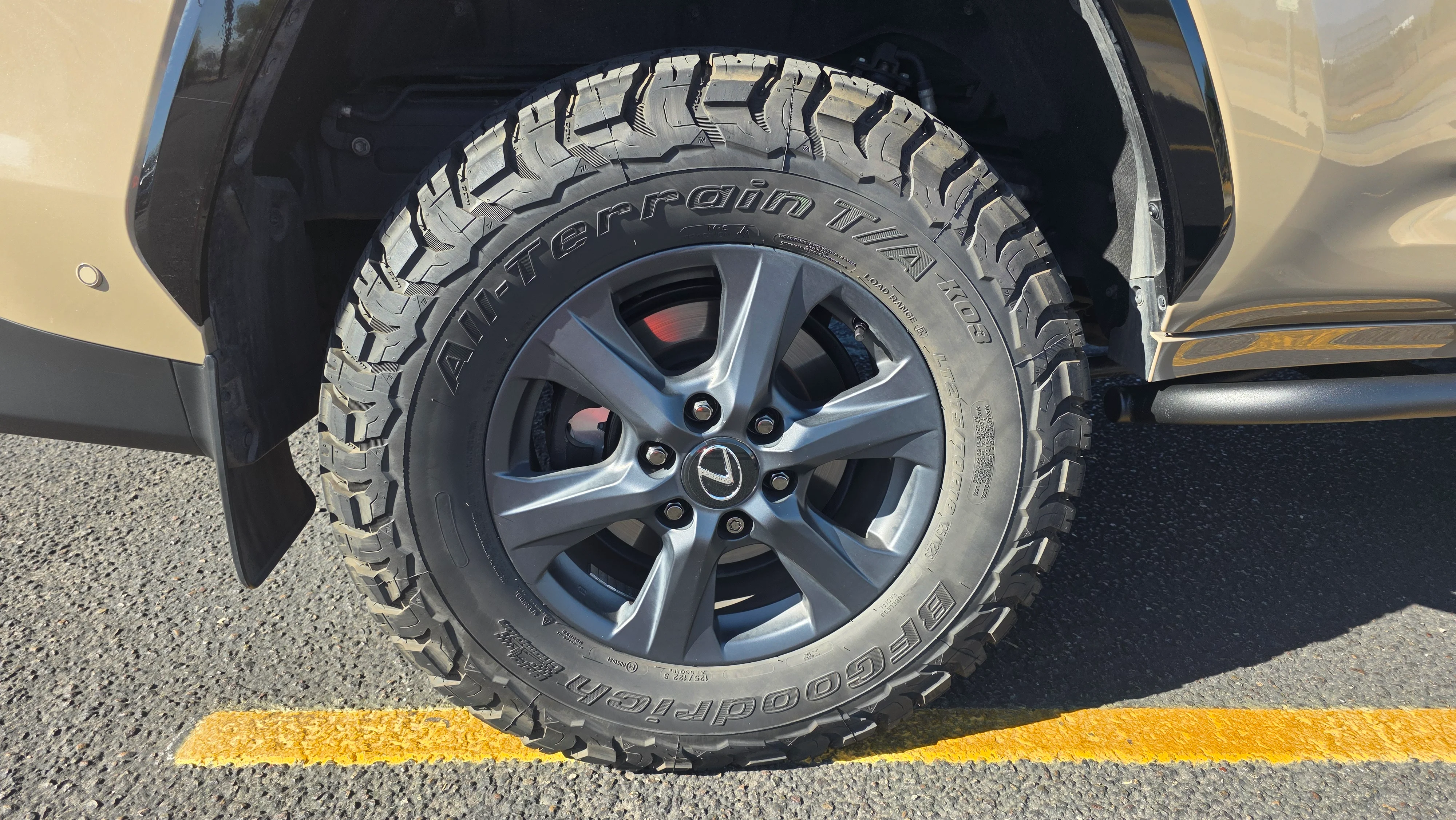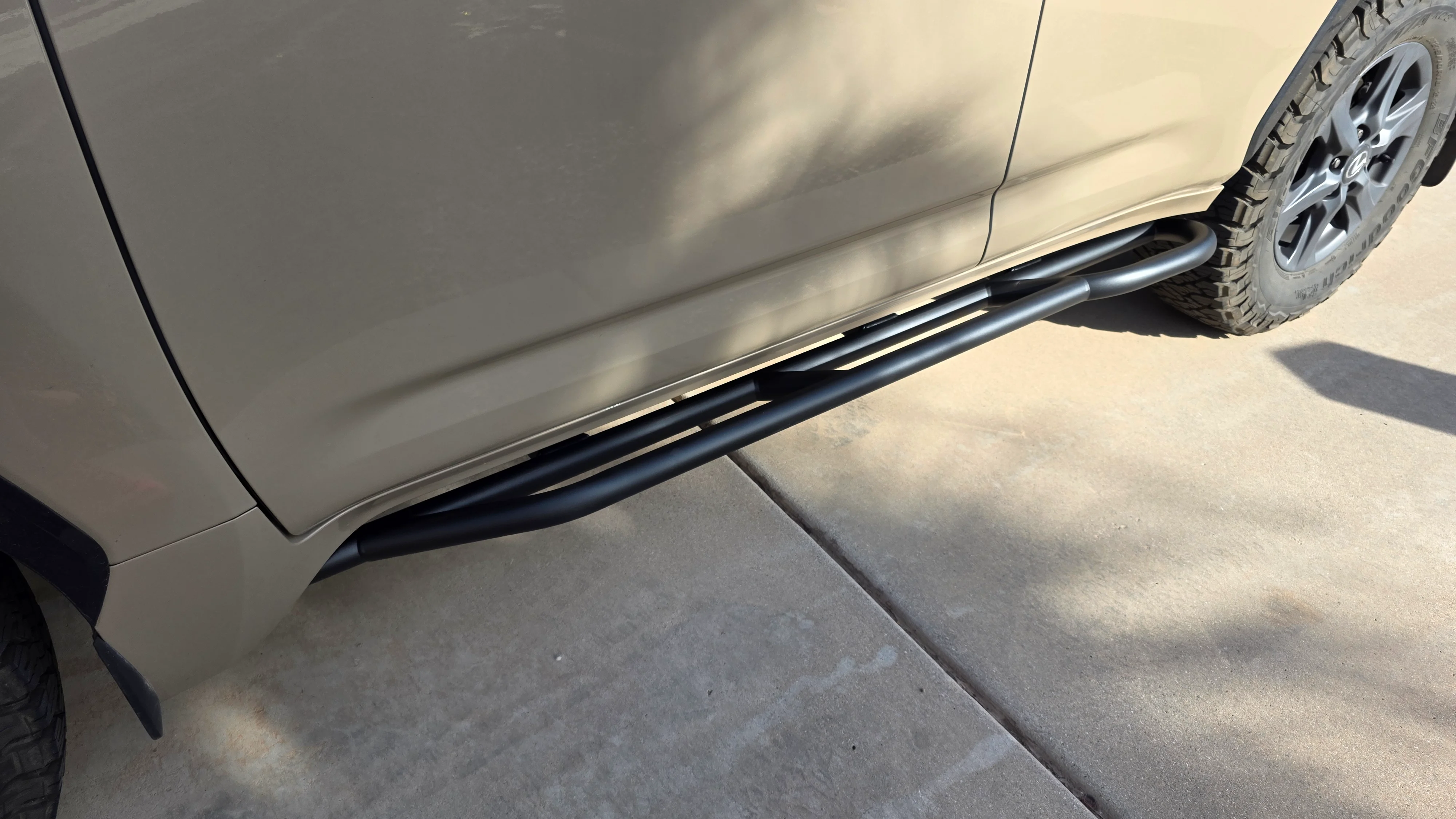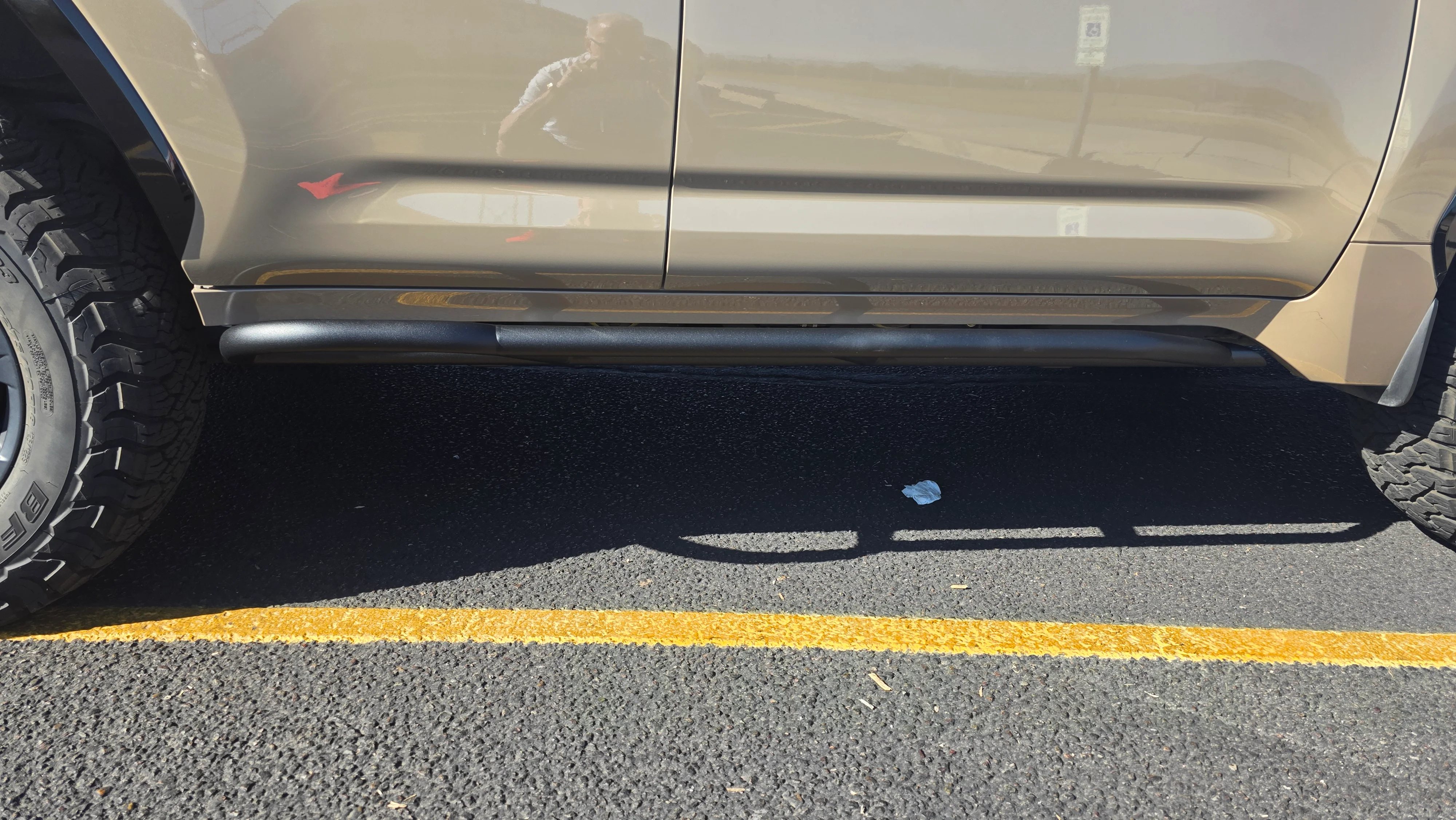Time to get wheeling...REAL A/T tires...KO3. Slightly larger at just a slip under 34". 100% NO rubbing in any height mode. Then I just got the first set of 700h sliders out there. From Westcott in Phoenix. GREAT business, owner, and staff. Black Friday special with 20% off totaled $2150 INSTALLED. They were about $500 more than the same set for the GX and 4Runners. There are more to these Westcott says. They bolt-on though there is one hold that needs to be drilled in the frame on each side. They sweat and stand by that these can take a severe beating on the rocks.